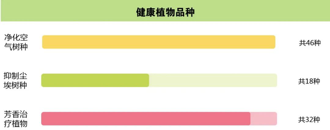 根据不同区域的健康植物栽种需求,漫格通过案例分析、项目整理,汇总了三种健康植物品种,从植物基本属性、生长特性和环境功效等多维度进行分析,总结出相应的施工建议。