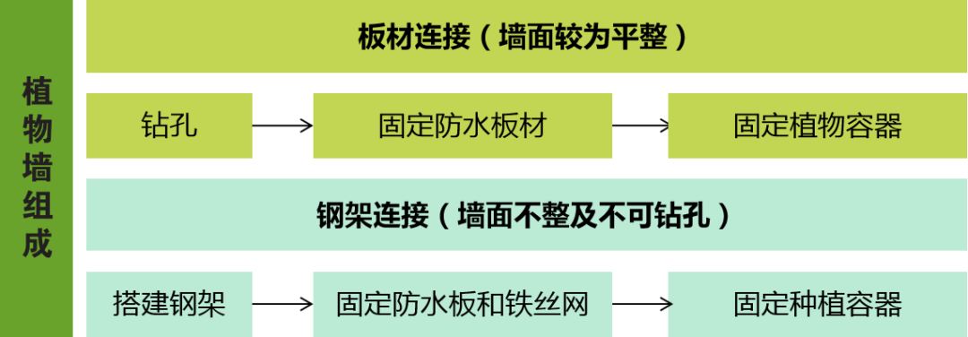 通常来讲,墙体分为混泥土墙、玻璃幕墙、砖墙、轻钢龙骨隔断等(也没有实体墙的)。根据不同植物墙的种植方式的特点及固定的要求,植物层与墙体的连接一般分两种方式;