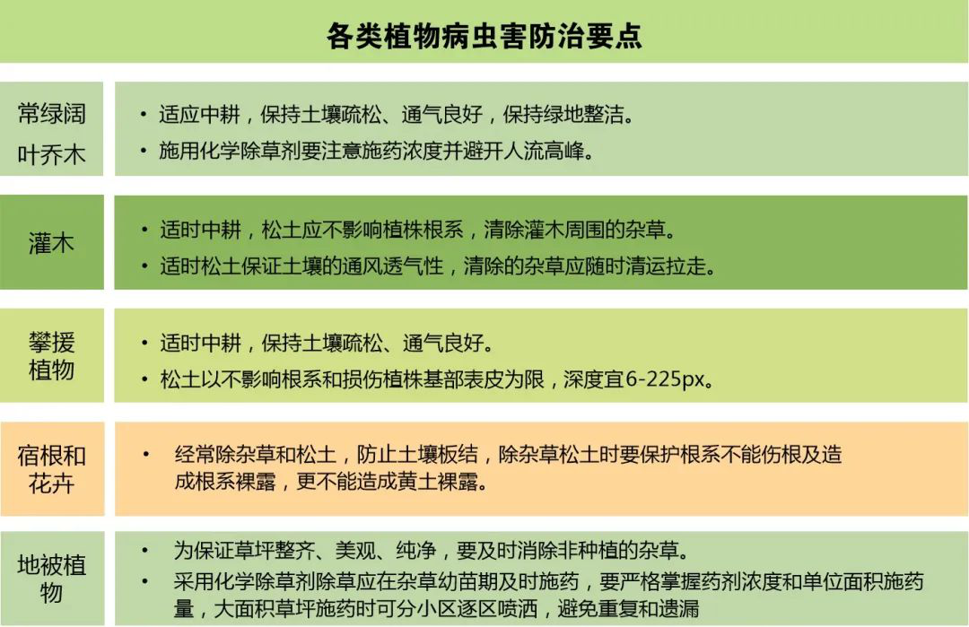植物在后期养护中经常会遭受病虫害的影响,导致植物枯黄或死亡,影响景观质量,在植物养护专篇中我们针对常绿、灌木、花卉、地被、藤本及攀援植物总结出相关病虫害防治要点。